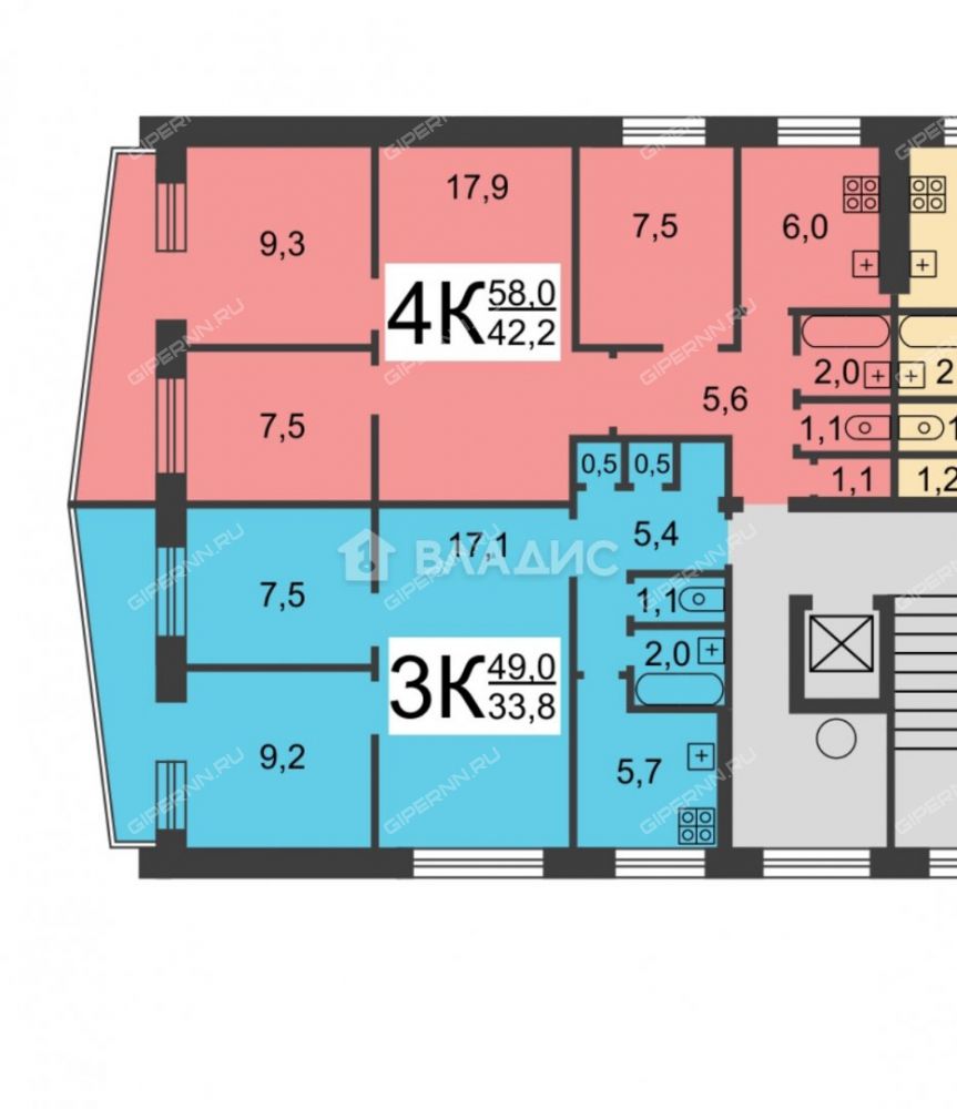 - комнаты 17,1, 9,2 и 7,5 кв.м,