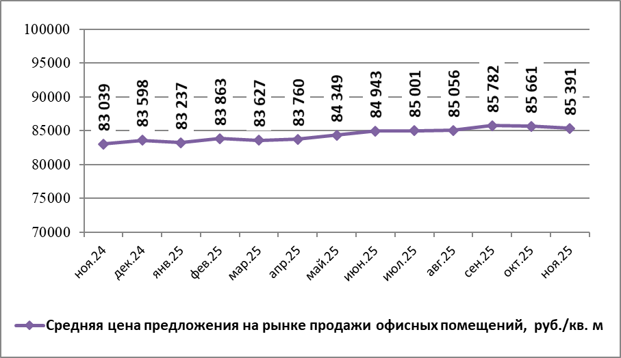 По данным Gipernn.ru на рынке продажи офисных помещений Нижнего Новгорода в ноябре 2025 года средняя цена предложения составила 85 390,91 руб./кв.м. По сравнению с предыдущим месяцем она понизилась на 0,32%.