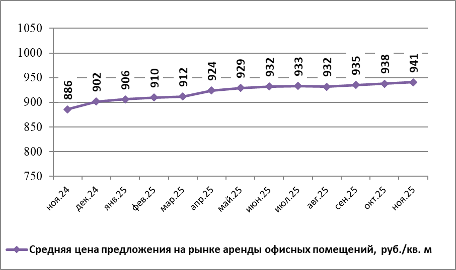 По данным Gipernn.ru на рынке аренды офисных помещений в Нижнем Новгороде ноябре 2025 года средняя цена предложения составила 940,61 руб./кв.м. По сравнению с предыдущим месяцем она повысилась на 0,29%.