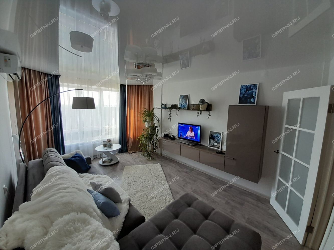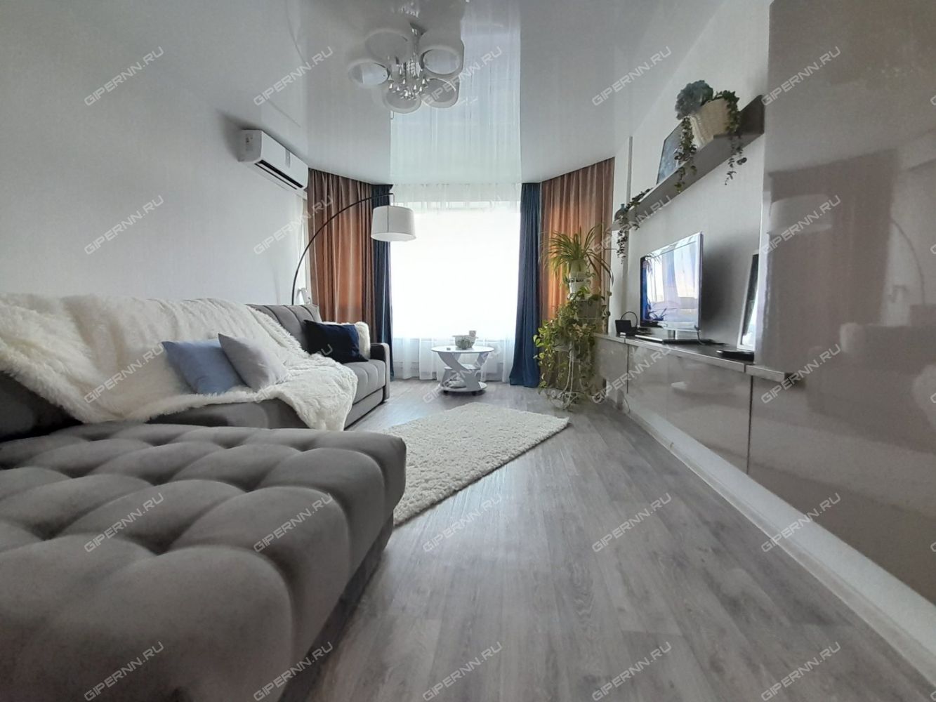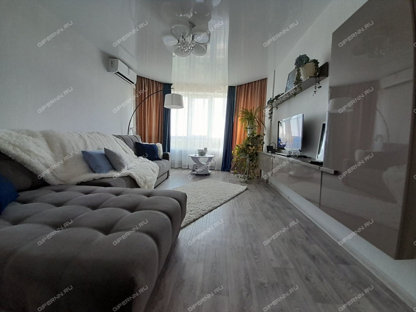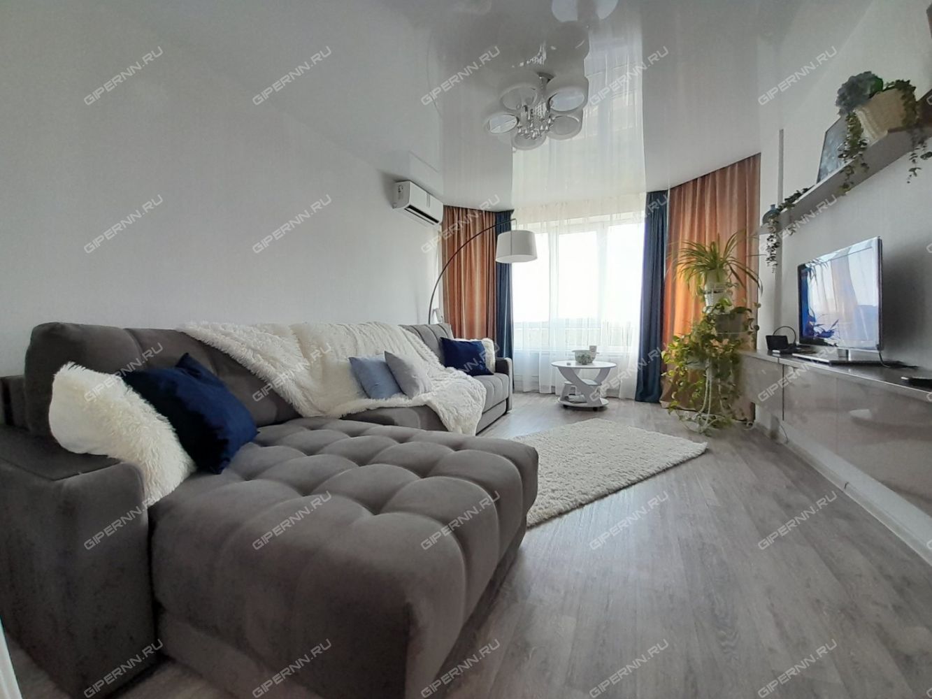 Видовая квартира с эркерными окнами до пола и большим ортопедическим диваном для ценителей комфорта.