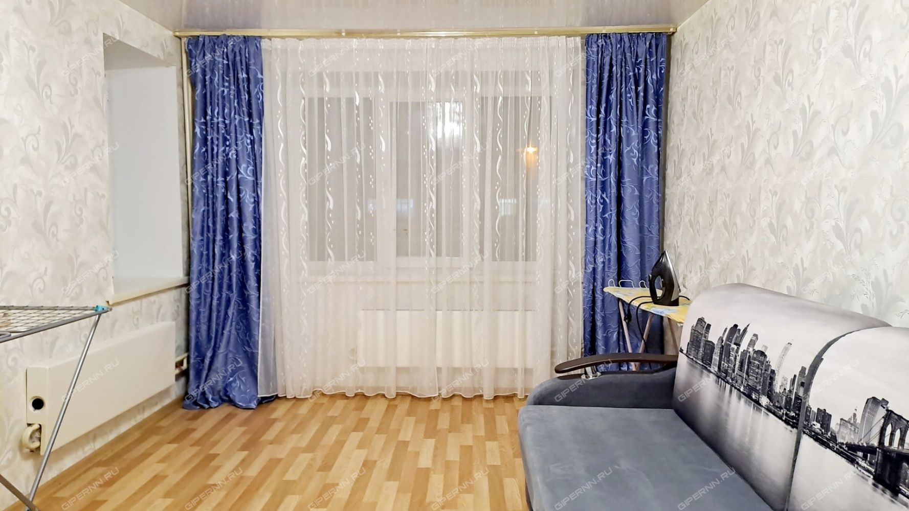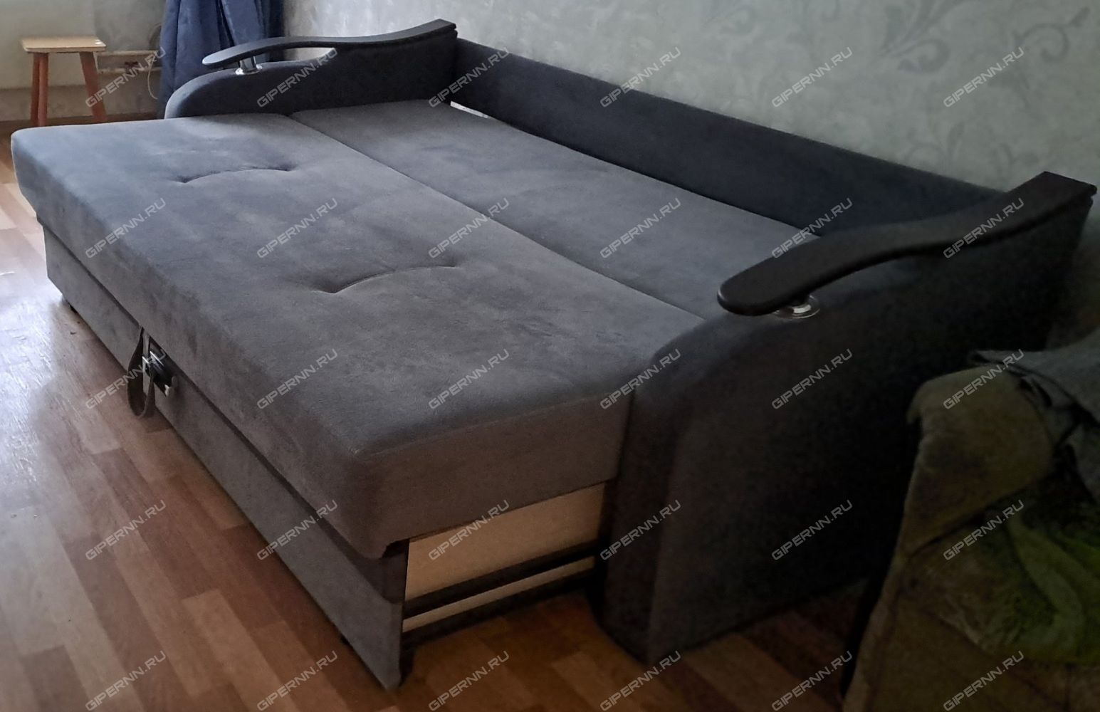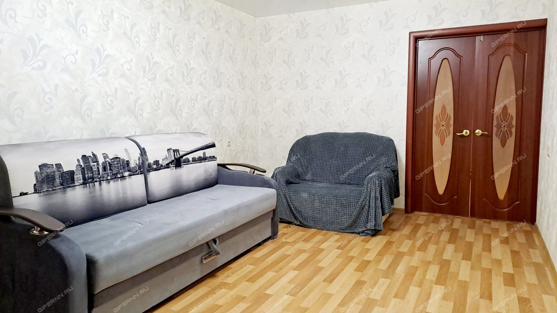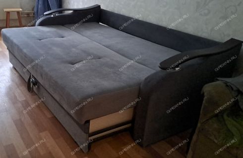 В большой жилой комнате два раскладных дивана. Один широкий и раскладывается до размеров двухспальной кровати. Второй диван раскладывается до размеров полутороспальной кровати.
