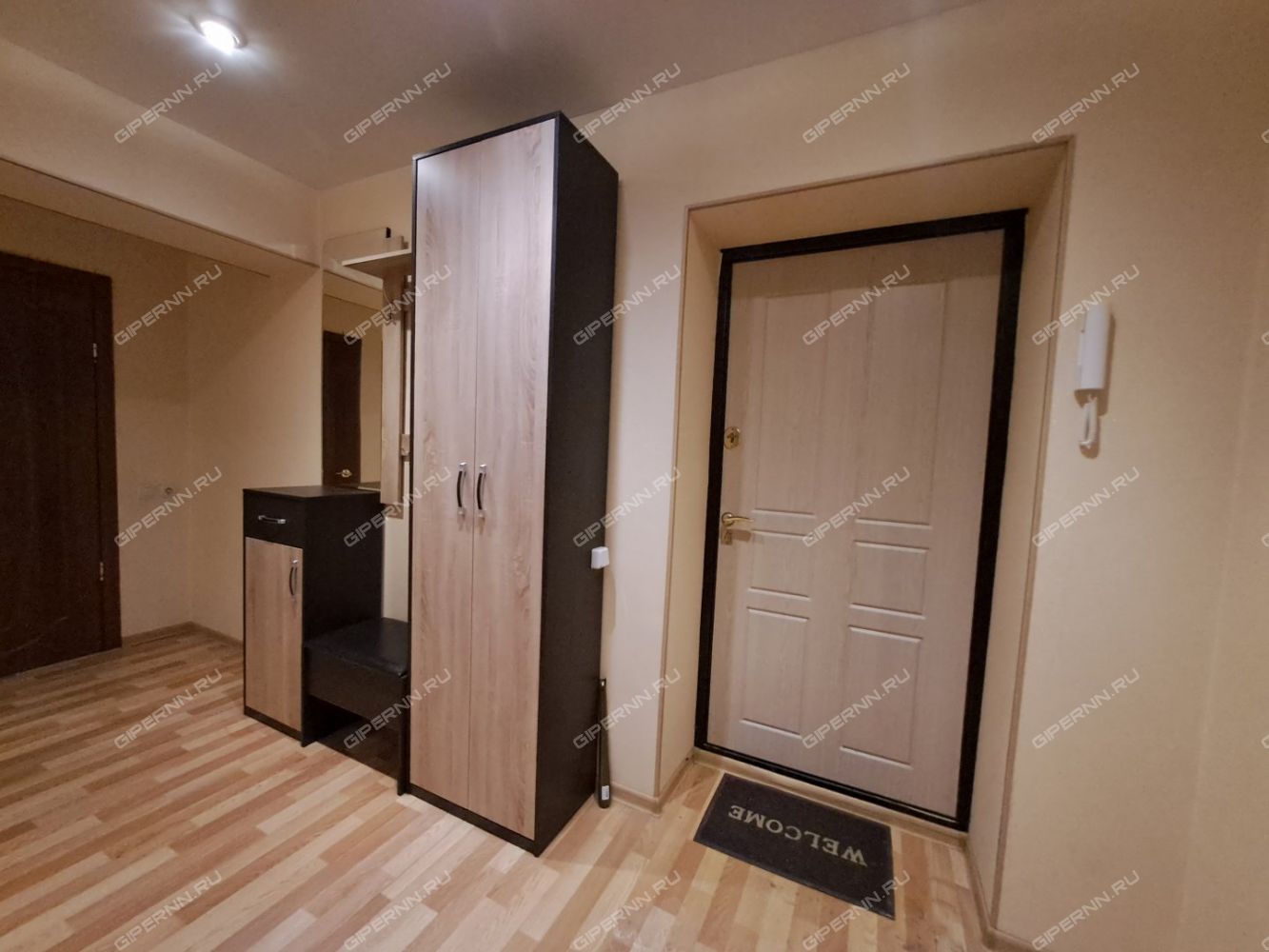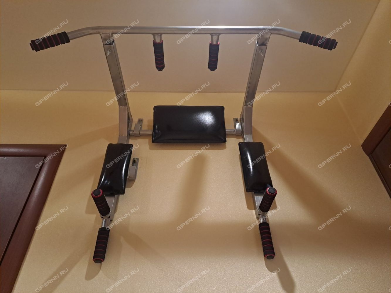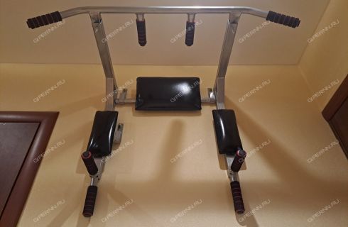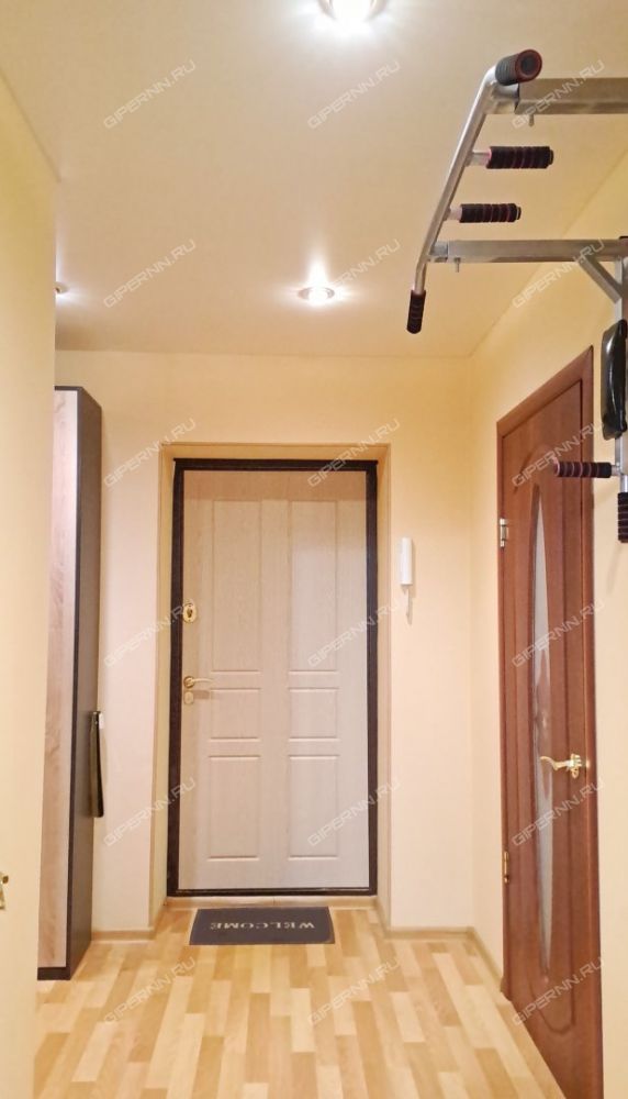 В прихожей достаточно места, есть зеркало с тумбочкой, полка для одежды, скамейка и узкий шкаф. Для занятий спортом подвешен турник.