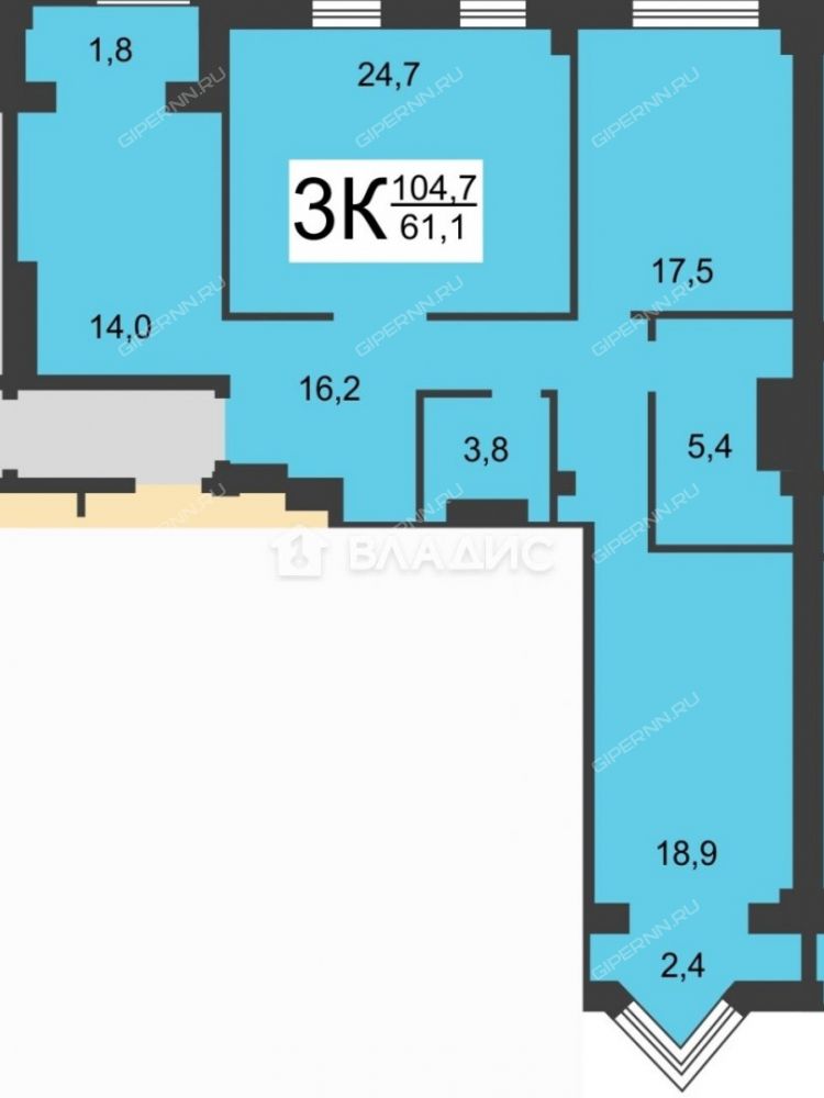 | Площадь | 104,7 / 61,1 / 14 |