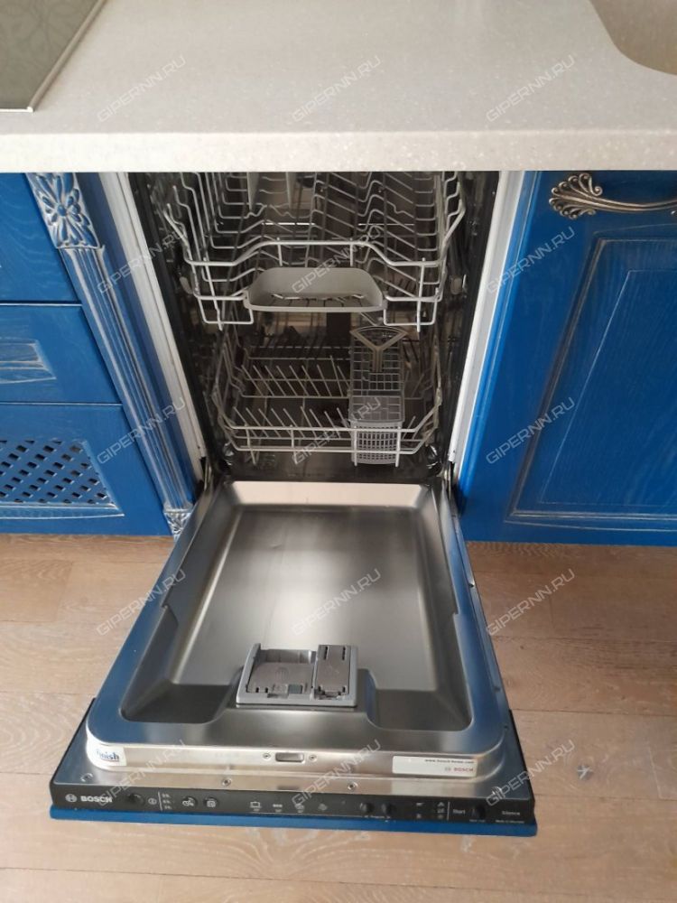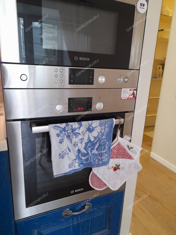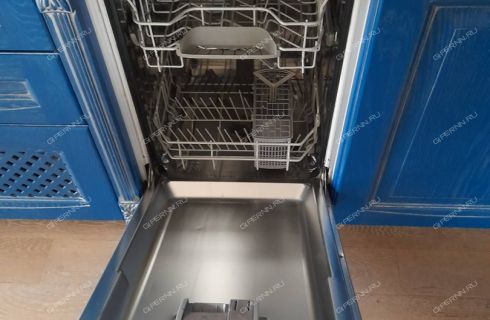 - Кухня со встроенной техникой: посудомоечная машина, скороварка, холодильник, варочная панель, духовой шкаф, электрический чайник, посуда и столовые приборы.
