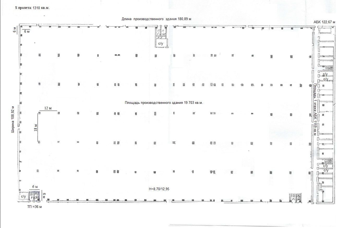 Сетка колон 12х18;Площадь пролета 1296 кв.м;Длина 109 м;Ширина 12 м.Новые коммуникации