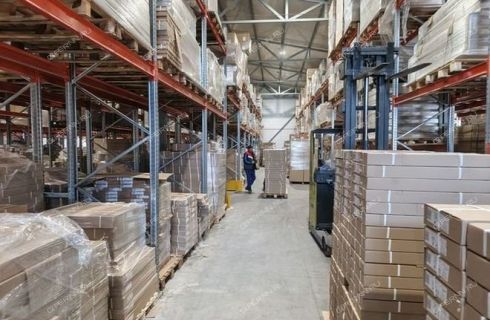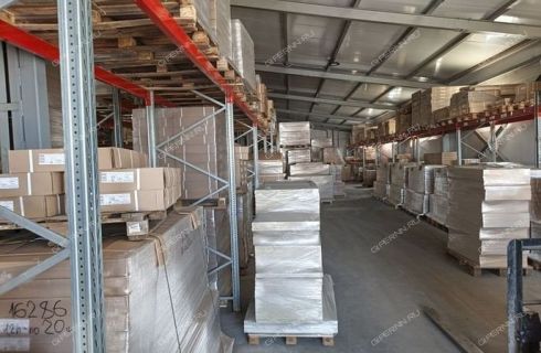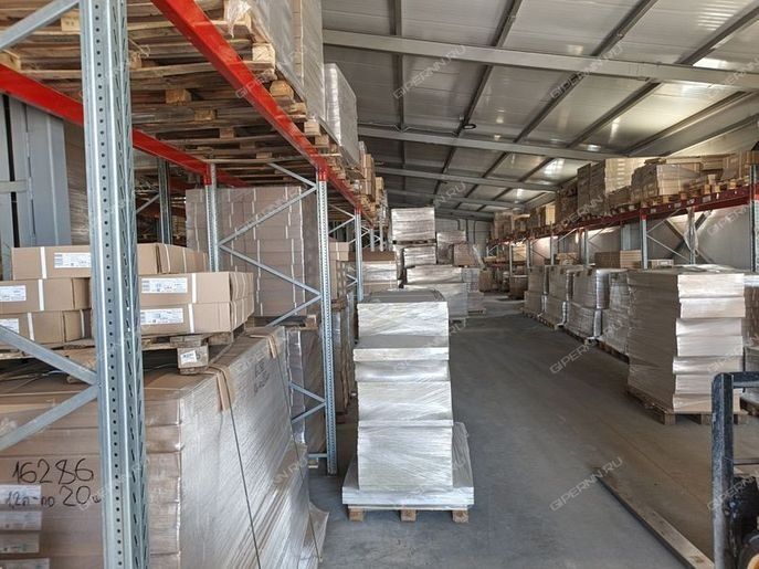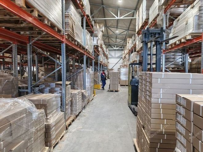 1800 м2 склад, оборудованный стеллажами в 3-4 яруса.