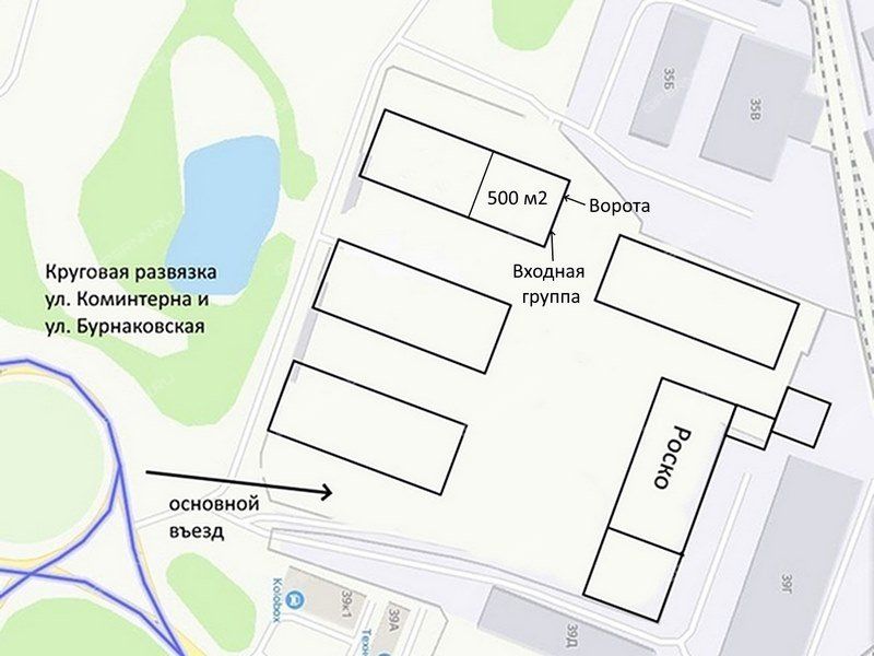 Помещение находится на территории торгово-складского комплекса, расположенного по красной линии на пересечении ул. Бурнаковская и ул. Коминтерна.