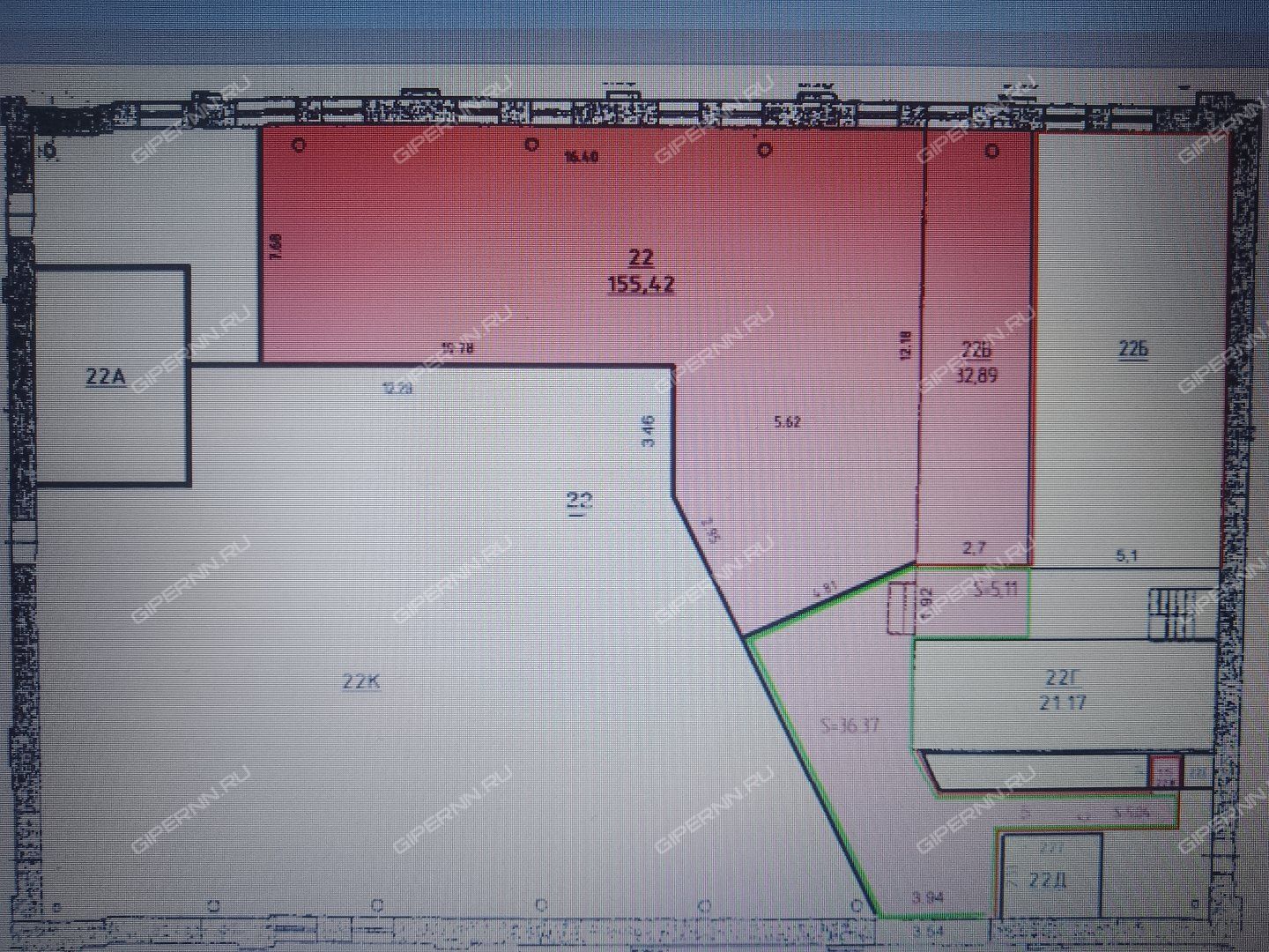 Площадь, которую можем сдать, обозначена красным. Зона, выделенная зеленым, в совместном пользовании (аренда 50%). Высота - 9м. Кран-балка - 3т. Ворота 3,5х4,3м (ШхВ).