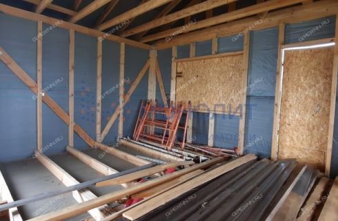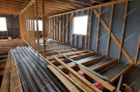 Дом спроектирован по каркасной технологии, кровля выполнена из профнастила. фундамент -винтовые сваи. По проекту в доме 4 комнаты, кухня, санузел.