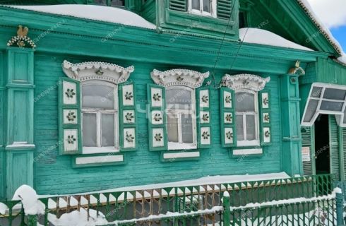 Арочные окна украшены старинными резными наличниками с лилиями, придающими дому неповторимый характер.