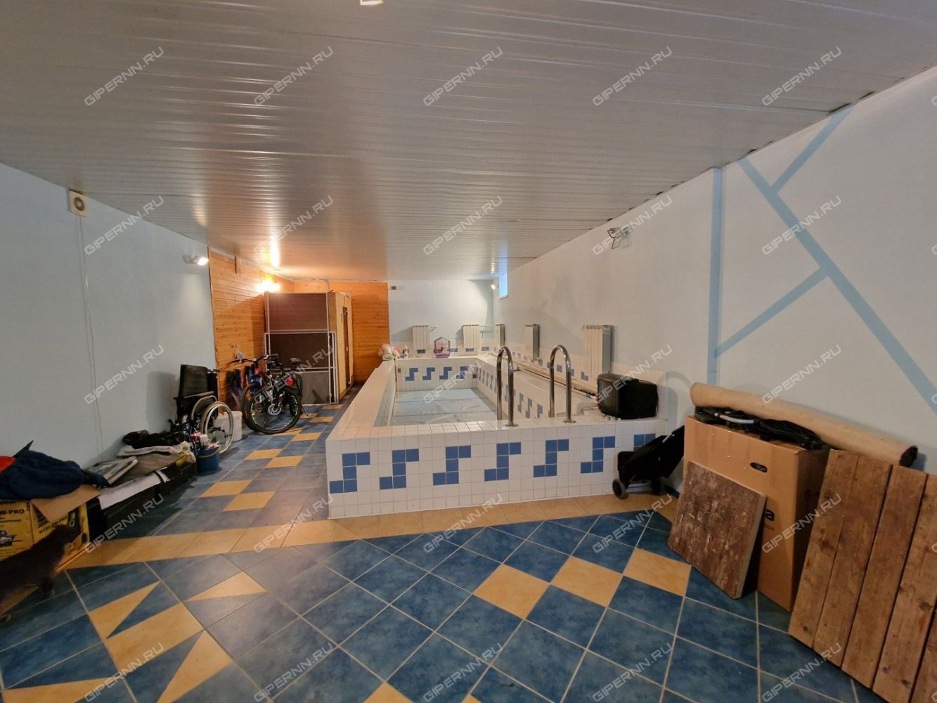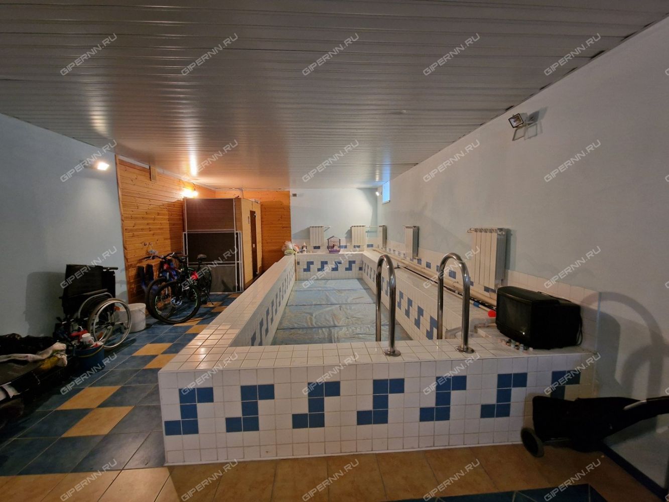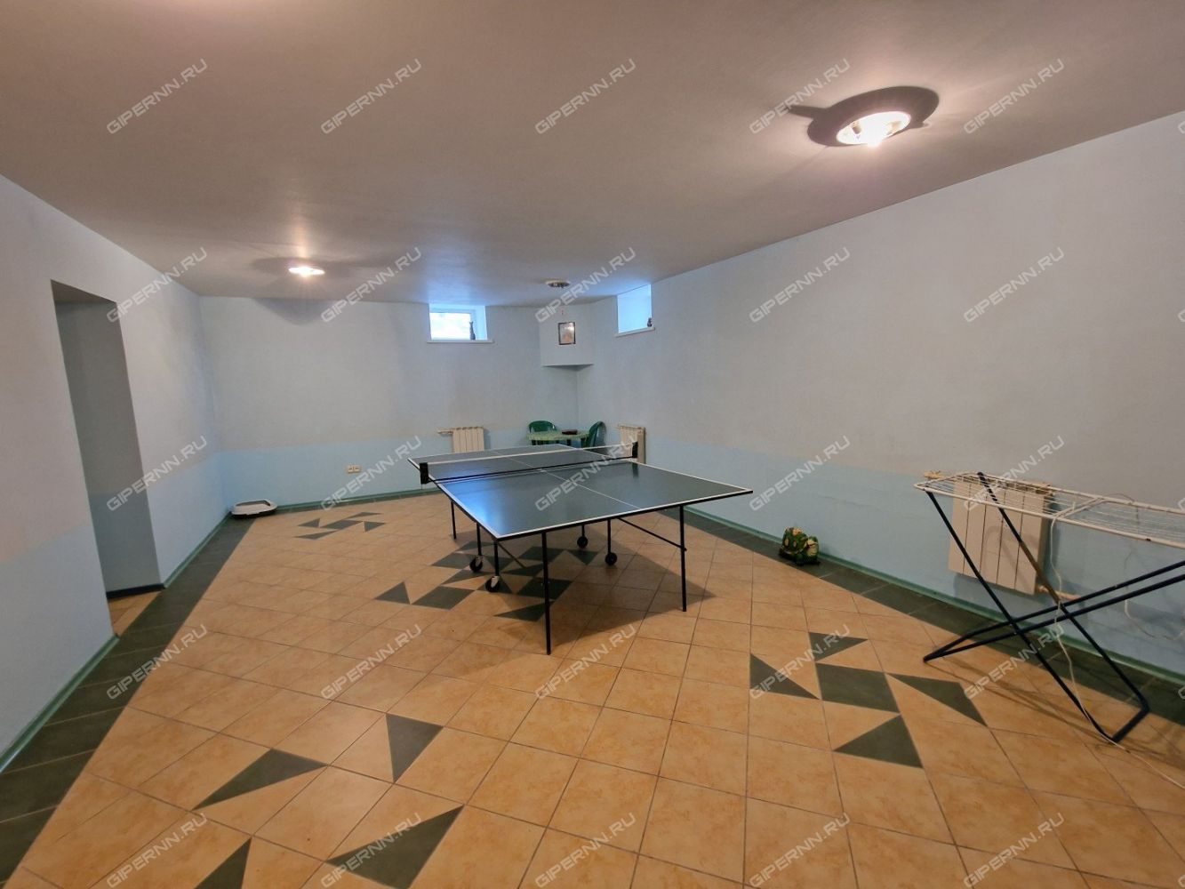 В Цокольном этаже расположен спорт-зал с теннисным столом. Помещение в котором расположен бассейн размер 6мх3м, глубина 1.7 м., так же есть Инфракрасная кабина на 4 человека.