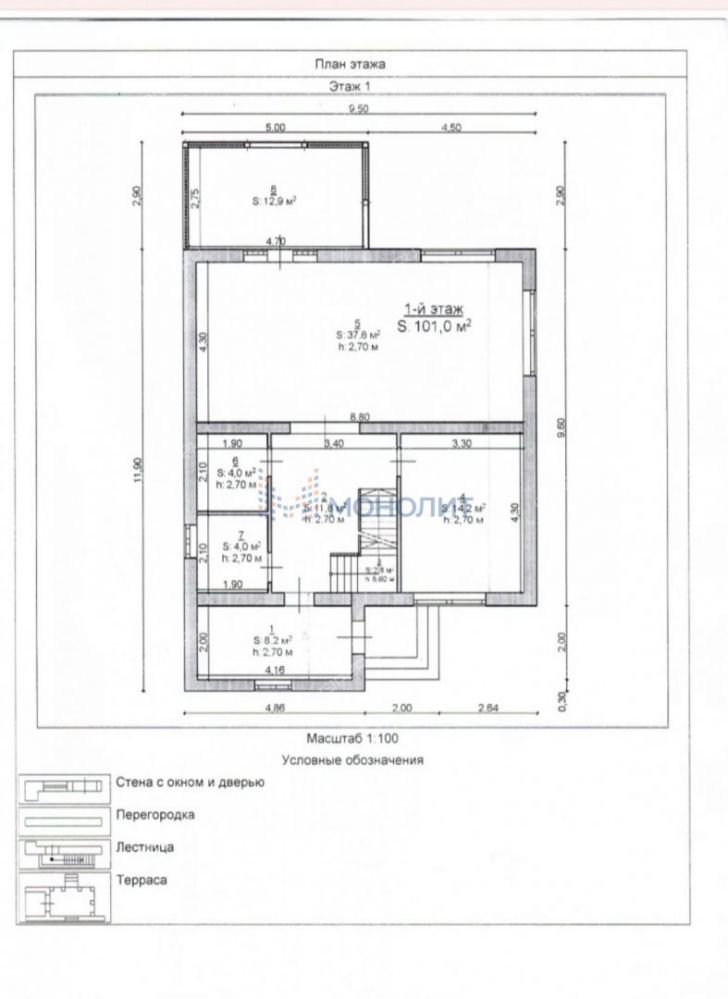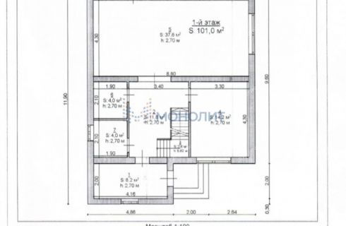- 1 этаж - входная группа, холл с лестницей на 2й этаж, котельная, кабинет, санузел, кухню-гостиная с выходом на террасу.