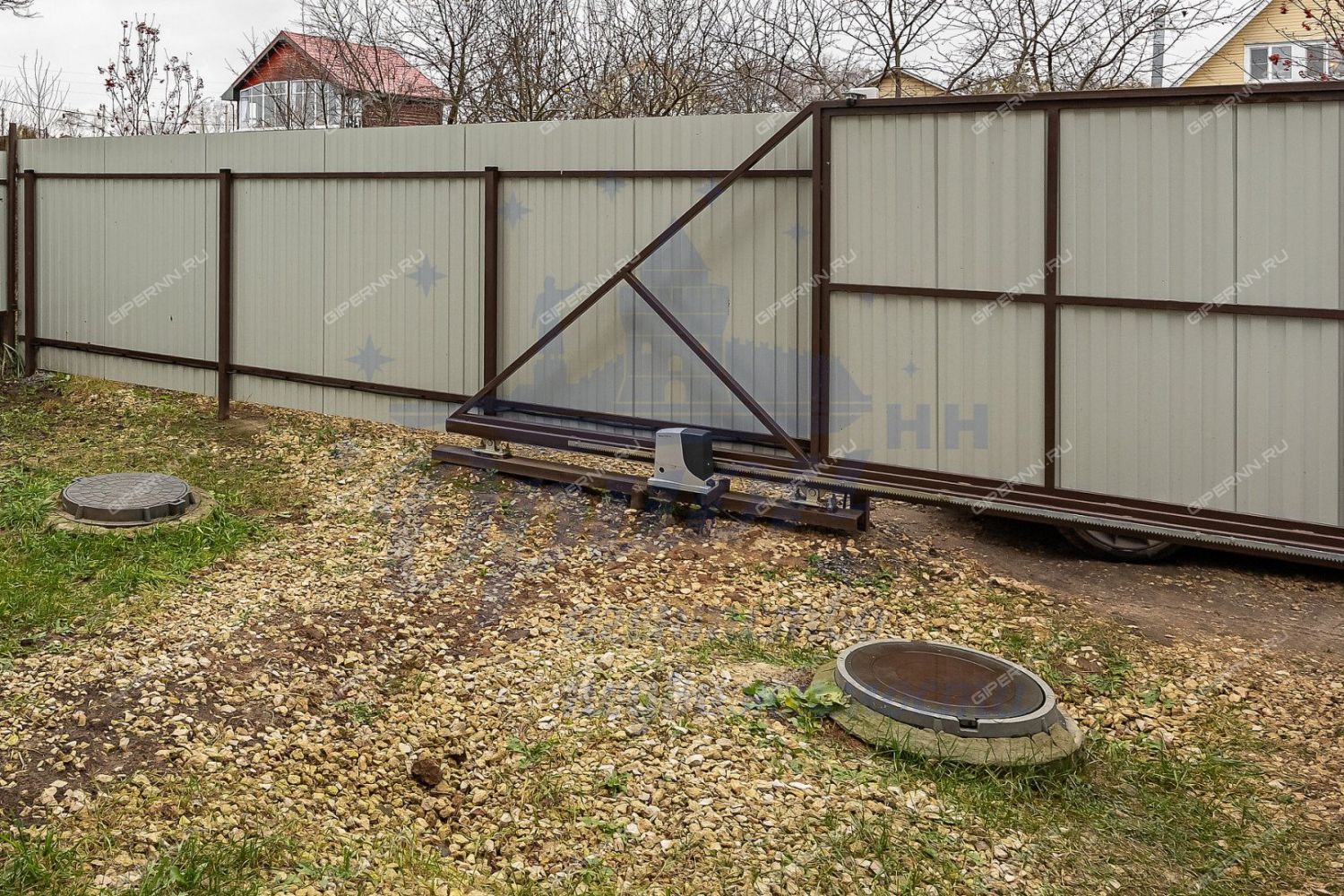 Огороженный земельный участок 4 сотки - ИЖС :Откатные ворота 5м.: С автоматическим приводом "NICE" (Италия) и функцией калитки с программированием.