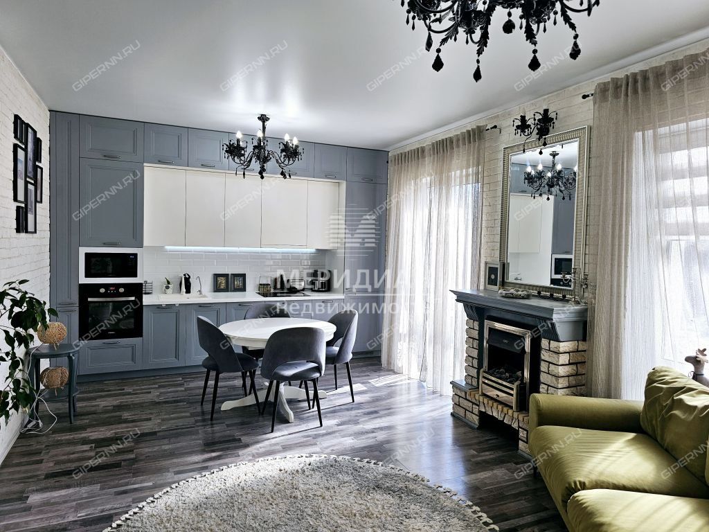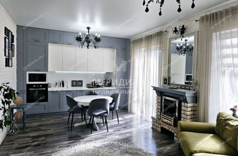 В кухне-гостиной дорогой кухонный гарнитур со встроенной подсветкой и техникой: индукционная варочная панель, духовой шкаф, микроволновая печь, холодильник. Установлен мощный кондиционер Haier. На заказ по индивидуальному проекту сделан стильный современный диван, установлен дорогой электро-камин.