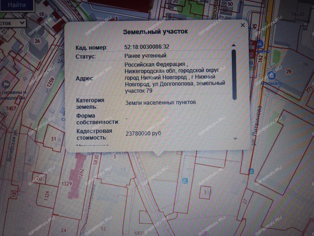 Земельный участок: Кадастровый номер 52:18:0030086:32, площадь 3718 кв. м. Категория: земли населенных пунктов. Виды разрешенного использования: под административное здание, здания шиномонтажа и автосервиса с дворовой территорией. Адрес: г. Нижний Новгород, ул. Долгополова, уч. 79.