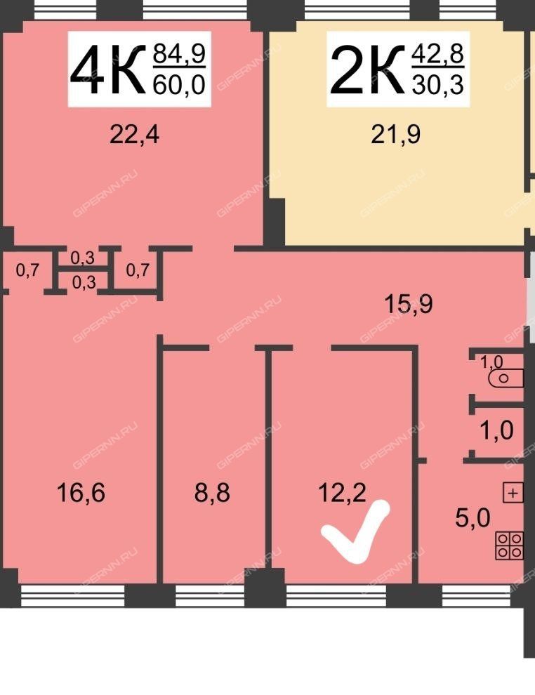 | Площадь квартиры | 84,9 / 60 / 5 |