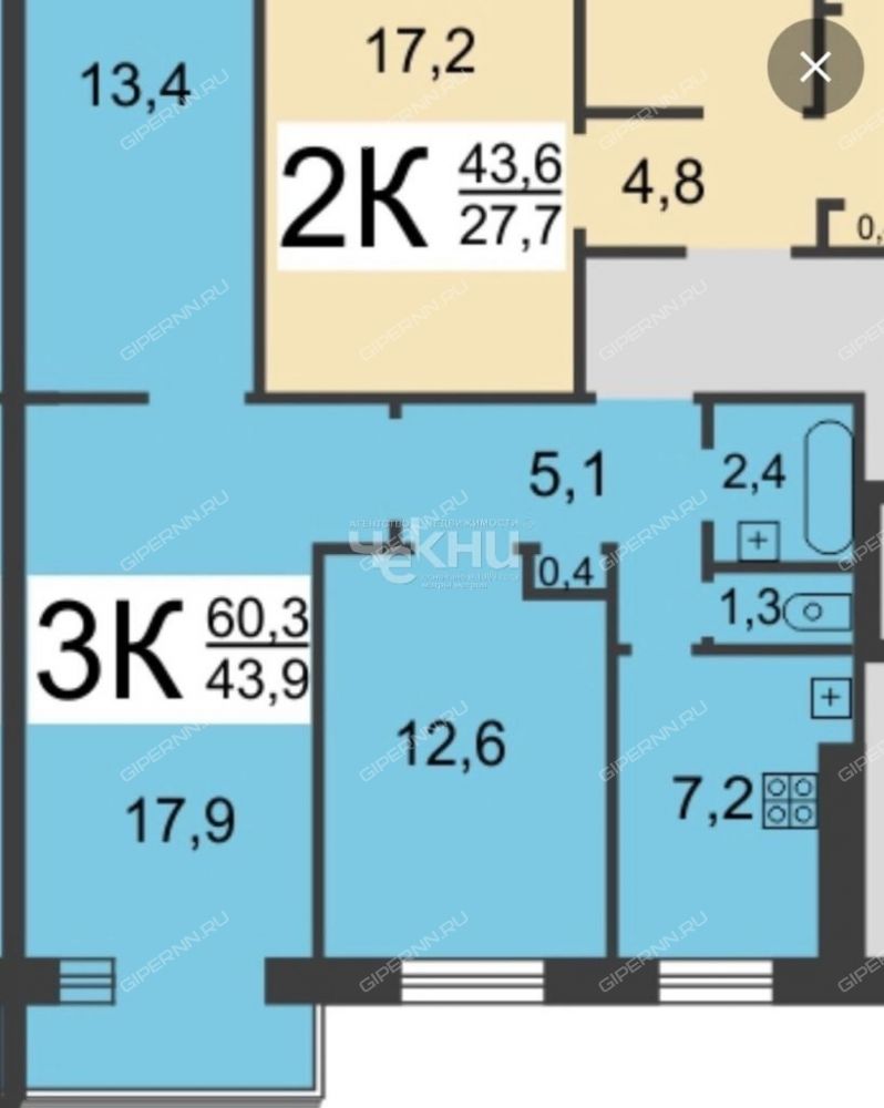 | Площадь квартиры | 60,3 / 43,9 / 7,2 |