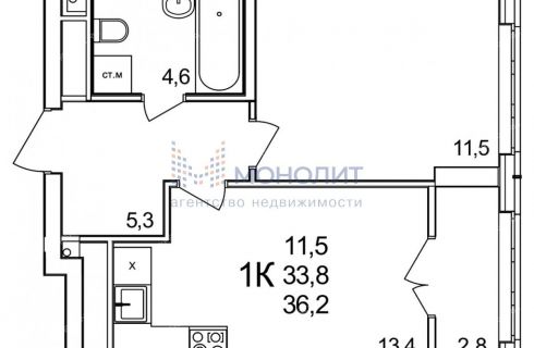 | Площадь | 36,2 / 11,5 / 13,4 |