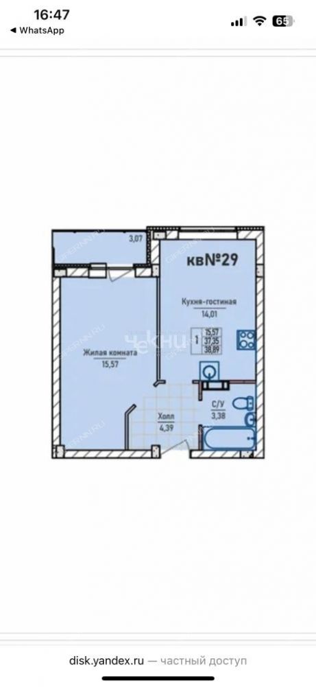 | Площадь | 38,89 / 15,5 / 14 |