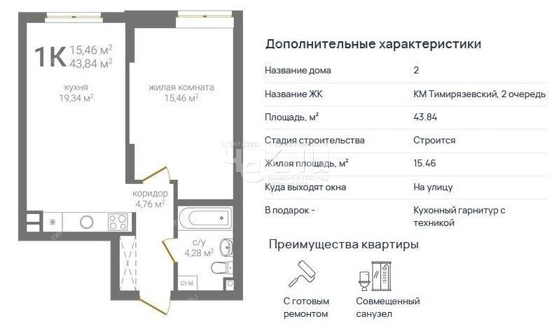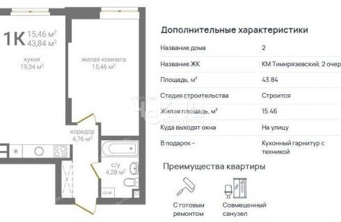 Квартира имеет общую площадь 52,08 м, включая кухню - 12,58 м и две комнаты - 14,24 м и 12,99 м. Отделка выполнена полностью, включая кухонный гарнитур с варочной панелью и духовкой, а также полный комплект сантехники в ванной комнате.