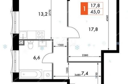 | Площадь | 45 / 17,8 / 13,2 |
