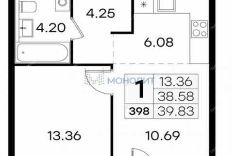 | Площадь | 39,83 / 13,36 / 16,77 |