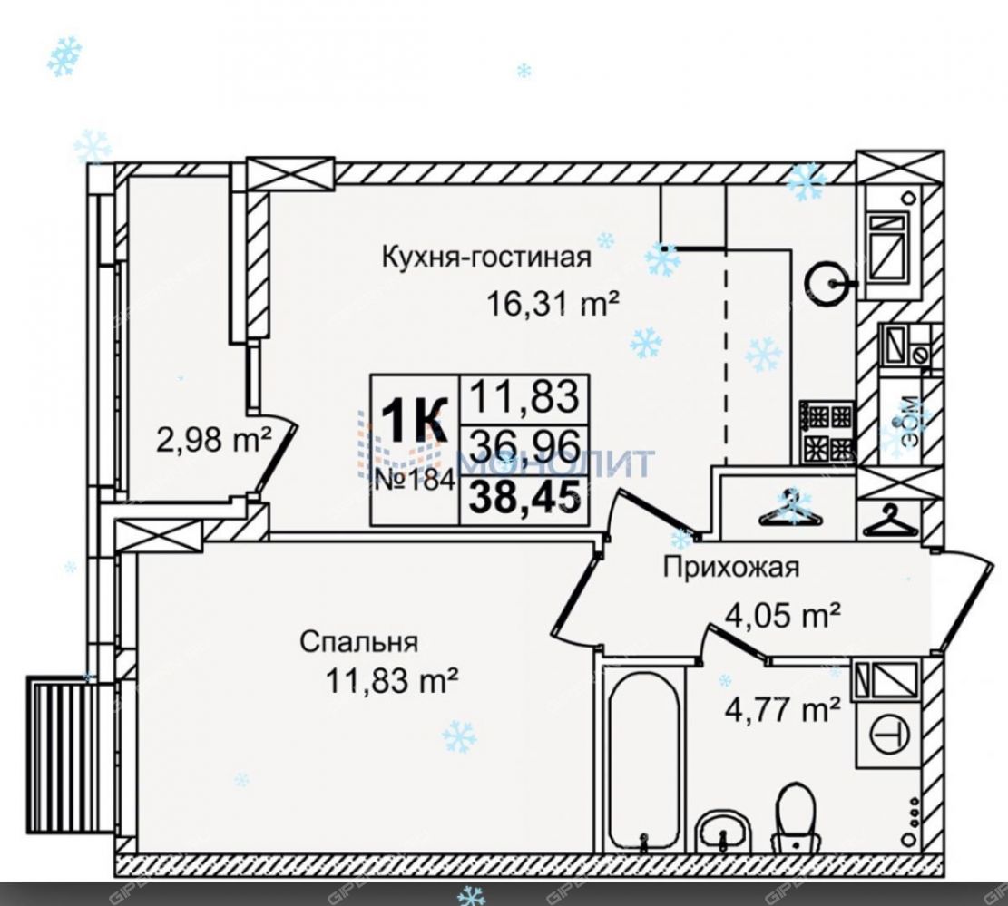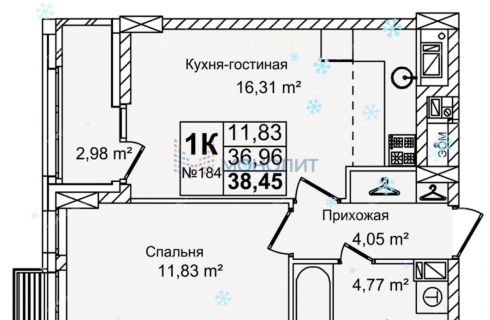 | Площадь | 38,45 / 11,83 / 16,31 |