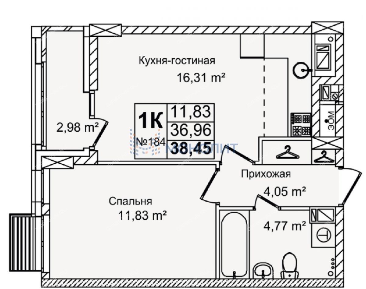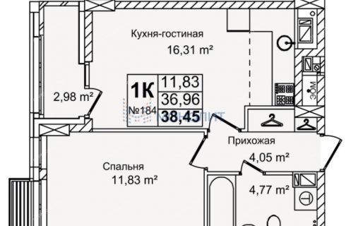 Кухня-гостиная 16.31 м, спальня 11.83 м.