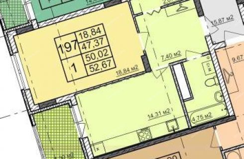 Планировка квартиры 1+. Общая площадь 52,67 кв.м., кухня-гостиная 14,31 кв.м. и комната 18,84 кв.м. Установлены пластиковые окна с двухкамерным стеклопакетом, выполнено одинарное остекление на лоджии, цементно-песчаная стяжка пола, штукатурка стен, гидроизоляция в санузле, установлены приборы отопления, выполнен ввод электричества в квартиру и установлен счетчик.