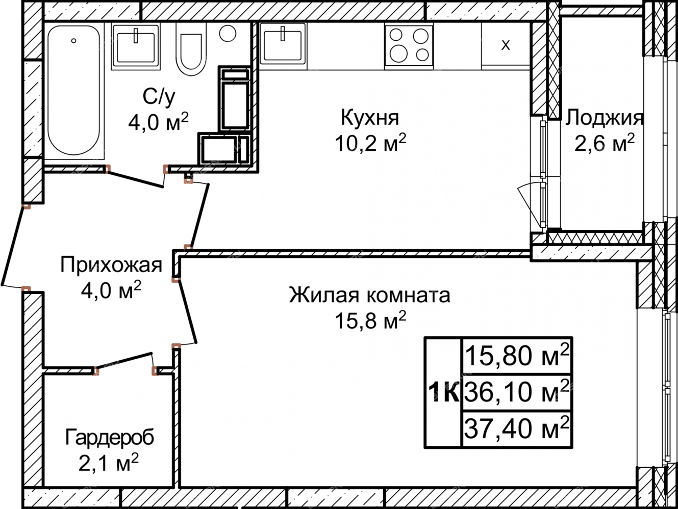 | Площадь | 37,4 / 15,8 / 10,2 |