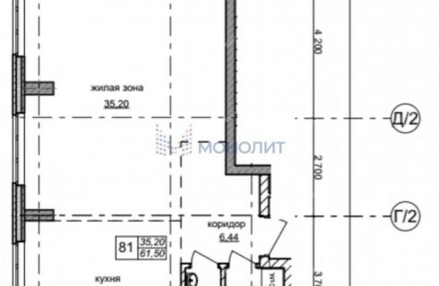 Общая площадь 61.5 кв.м. Кухня-гостиная 15 кв.м. Детская 15.2 кв.м. Спальня 20 кв.м.