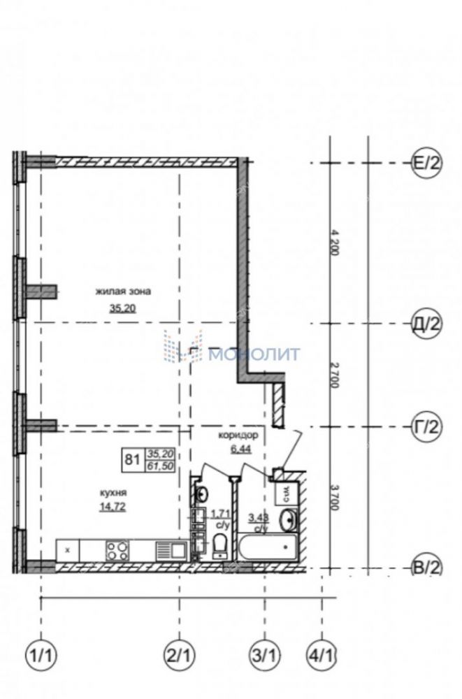 | Площадь | 61,5 / 35,2 / 15 |