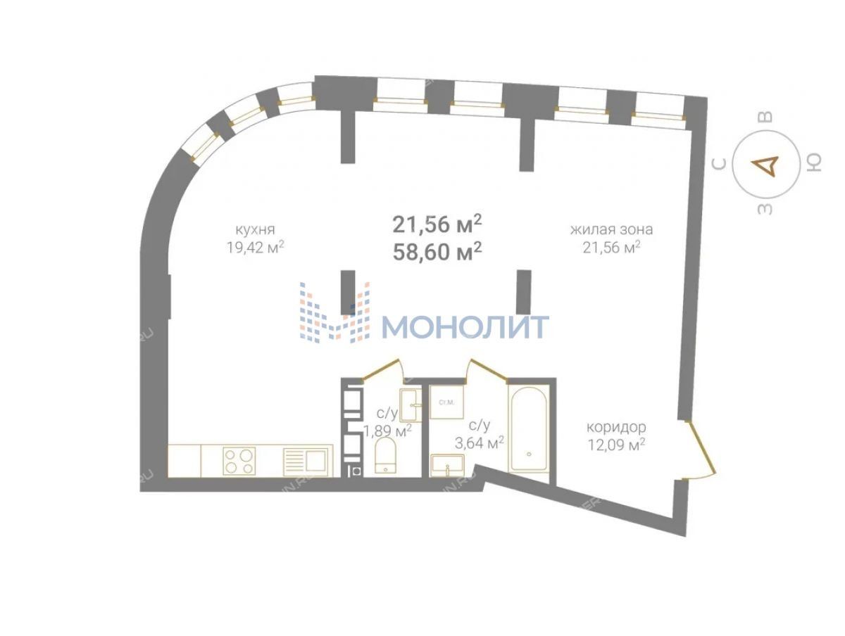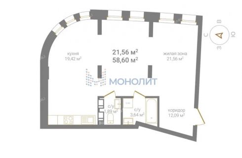 Площадь58,6 / 21,56 / 19,42