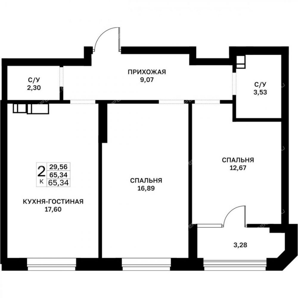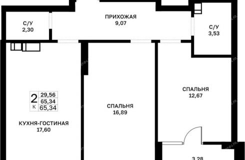Площадь | 65,34 / 29,56 / 1 |