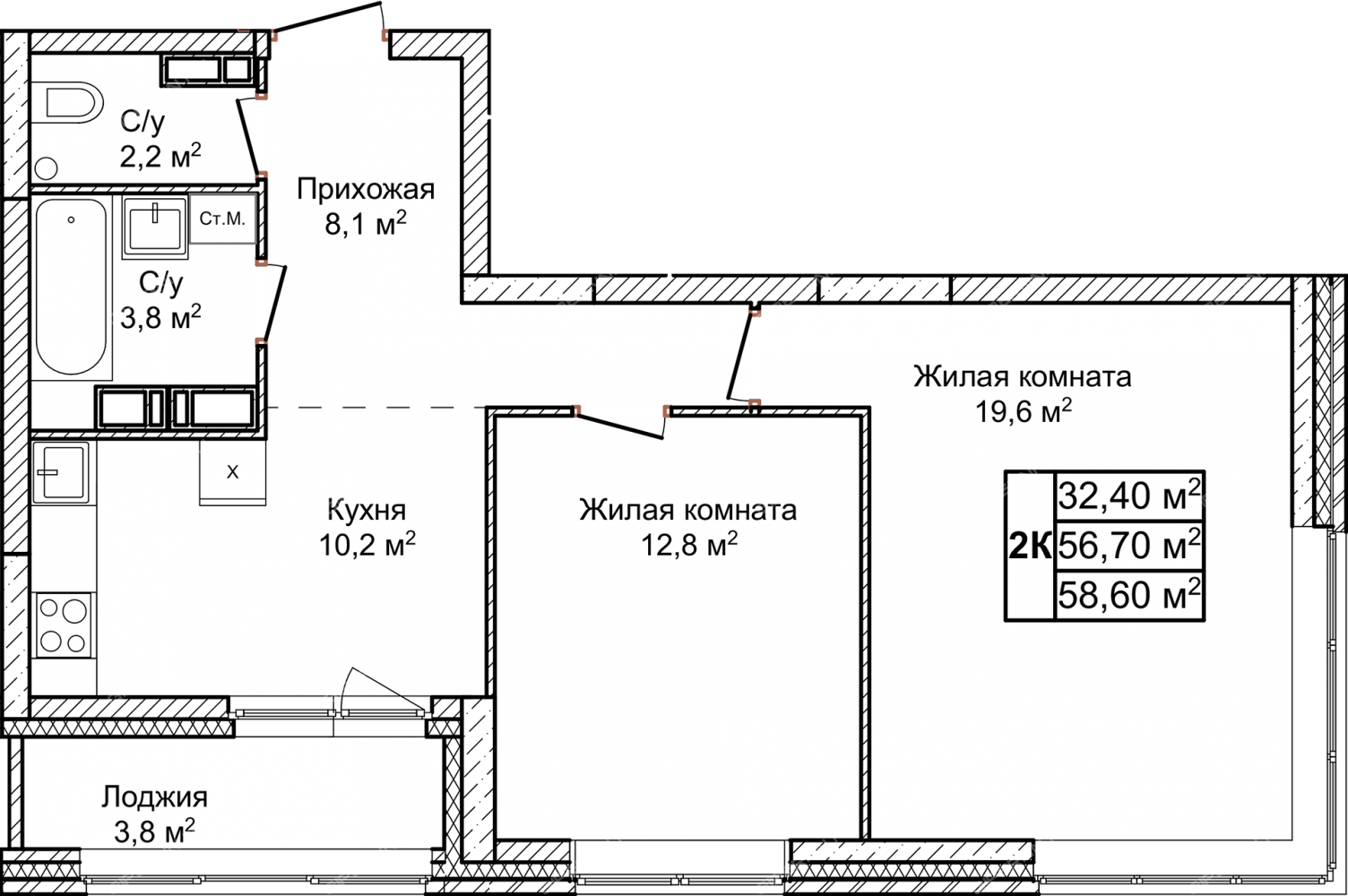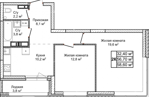 Площадь58,6 / 32,4 / 10,2