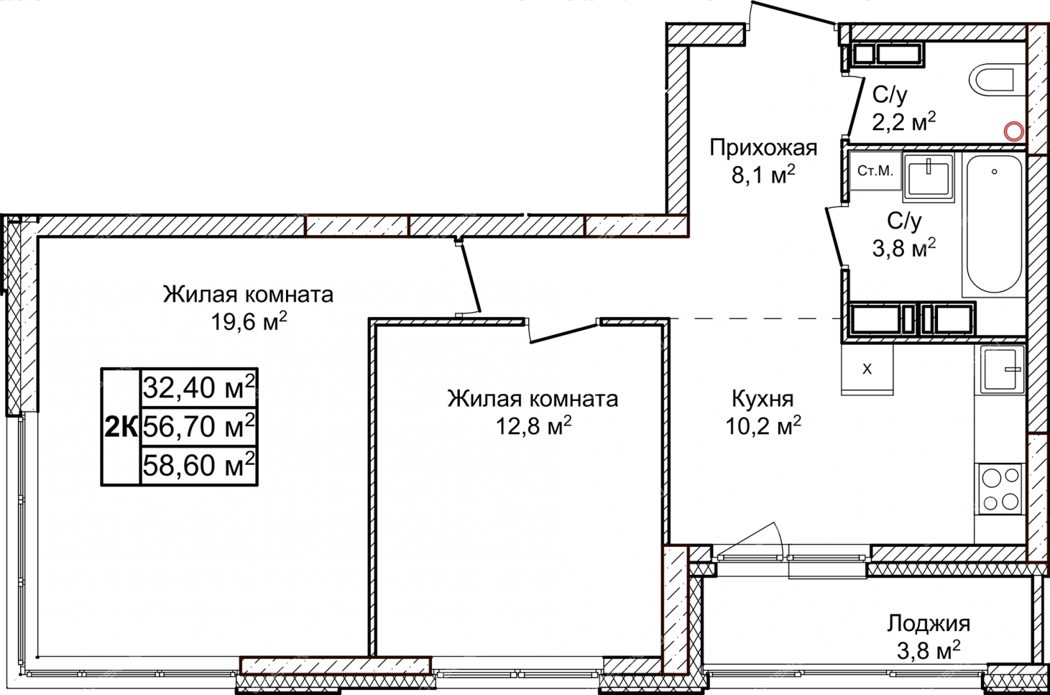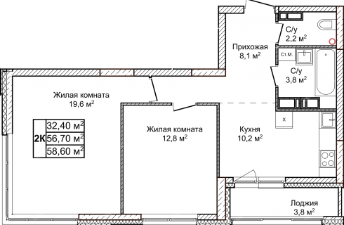 Площадь58,6 / 32,4 / 10,2