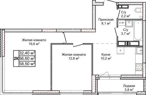 | Площадь | 58,5 / 32,4 / 10,2 |