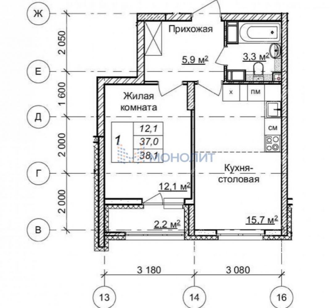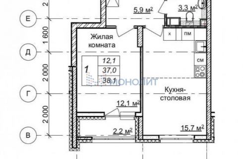 Общая площадь квартиры составляет 38,1 кв.м., при этом кухня-столовая занимает 15,7 кв.м. Просторная комната площадью 12,1 кв.м. позволит создать уютное место для отдыха и работы. Современный санузел с качественной плиткой приятно удивит своим дизайном.