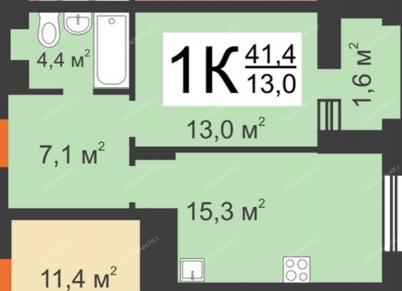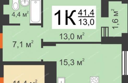 | Площадь | 41,4 / 13 / 15,3 |