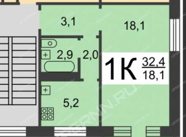 | Площадь | 32 / 18,4 / 5,2 |
