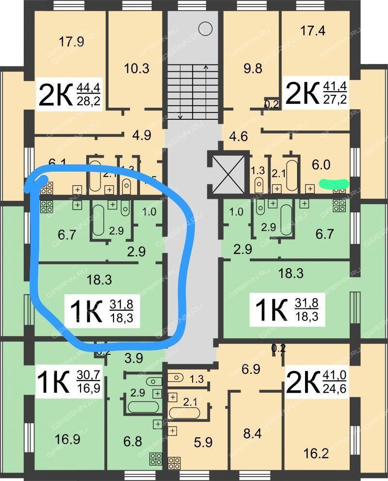 Общая площадь 31.8 м. кв, с лоджией - 34 м. кв.