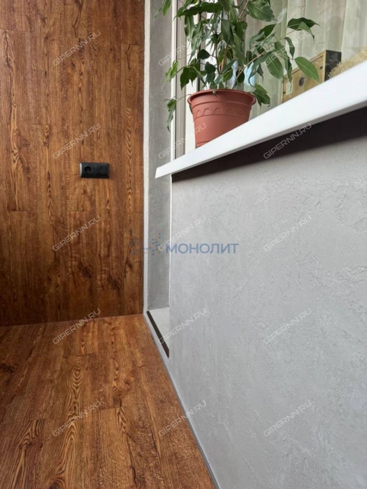 Балкон полностью утеплен ( стены и потолок 50мм, пол 100мм), выложен клеевой кварцвиниловой плиткой и отделан декоративной штукатуркой. На балкон заведена электрика.