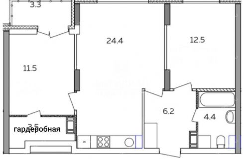 Планировка: 2 изолированные комнаты площадью 12,5 и 11,5 кв.м (одна из которых с собственной гардеробной 3,5 кв.м), большая кухня-гостиная 24,4 кв.м, ванная комната 4,4 кв.м, просторная прихожая 6,2 кв.м, остекленная лоджия.
