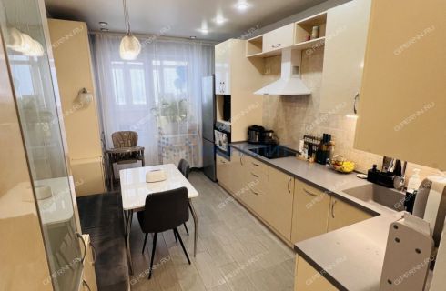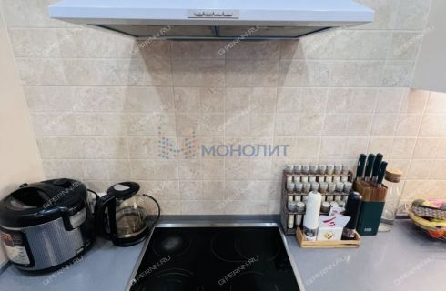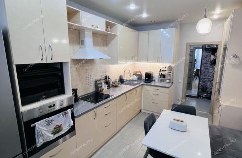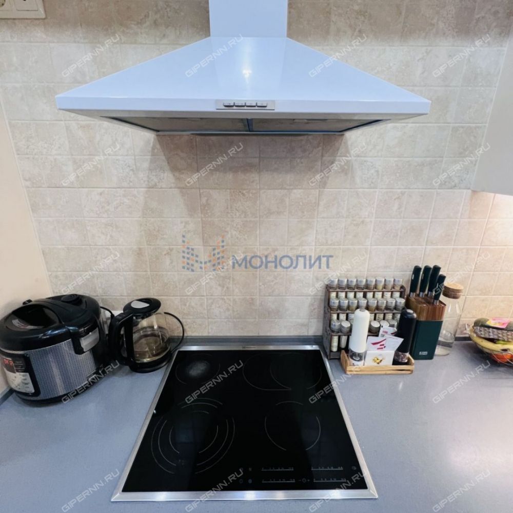 Кухня оснащена кухонным гарнитуром со встроенной варочной поверхностью. Гарнитур с достаточной рабочей поверхностью и достаточным количеством мест хранения.