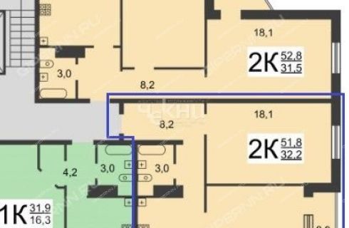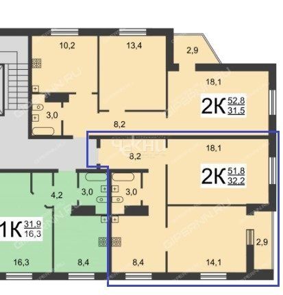 | Площадь | 51,8 / 32,2 / 8,4 |