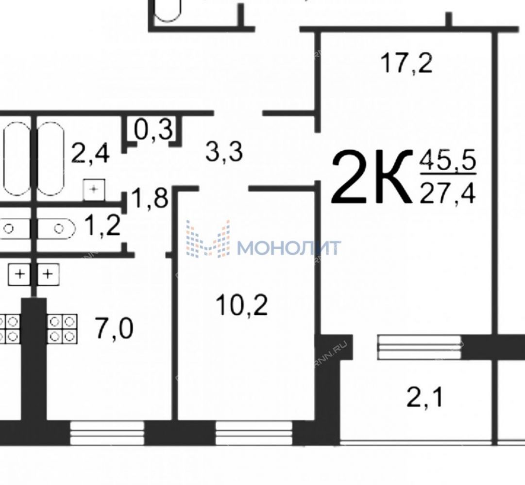 Площадь комнат - 17.2, 10.2. м2. Кухня - 7м2. Большая комната - есть возможность зонировать и отделить кабинет, спальное место или детскую.