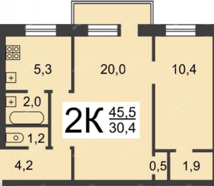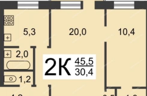 Жилая - 30,4 кв.м, кухня - 5,3 кв.м.