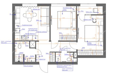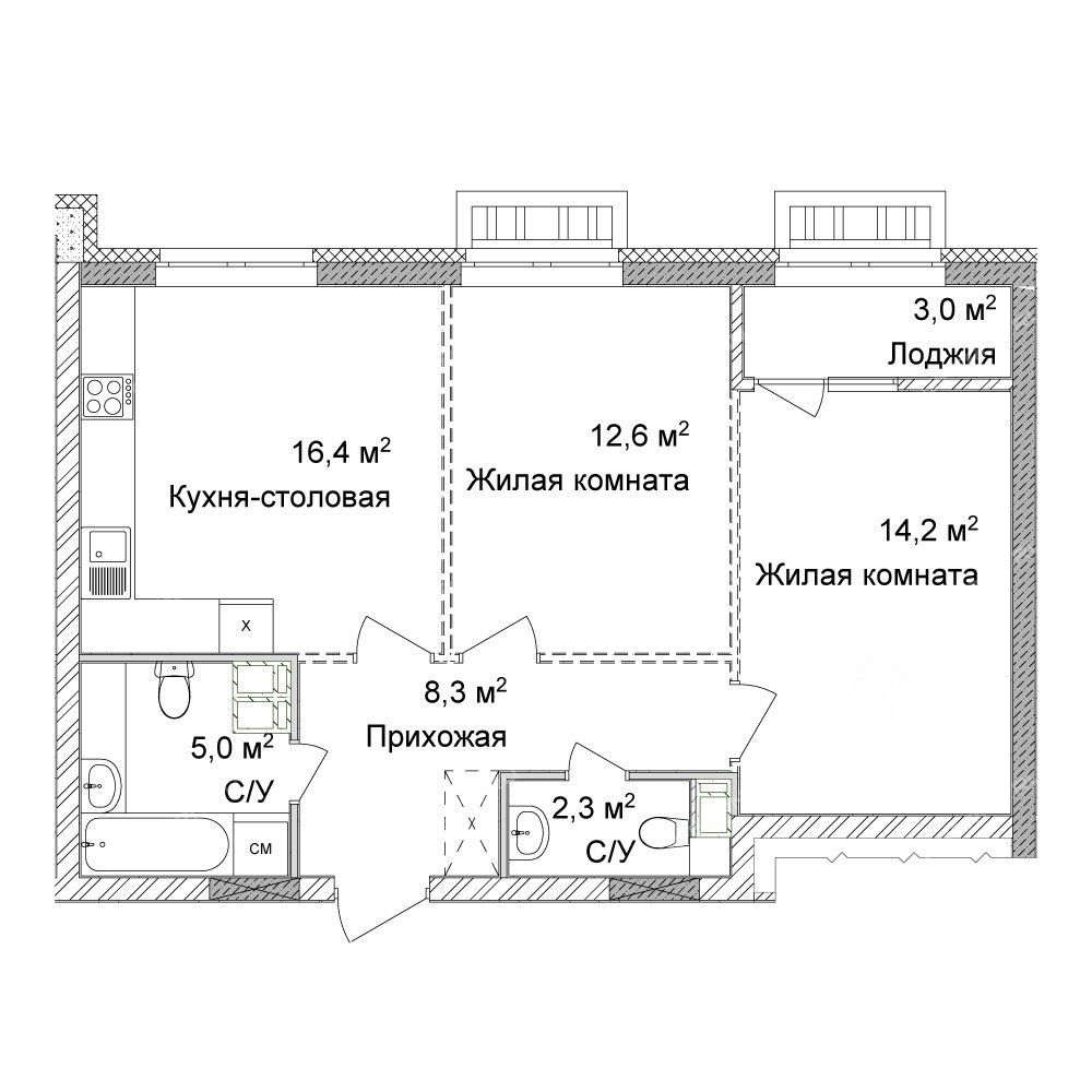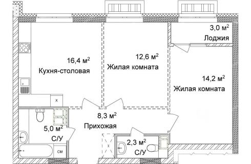 Если Вам необходимо спроектировать две изолированные комнаты, то планировка может быть следующей: кухня-гостиная - 16,4 кв.м, комната - 12,6 кв.м, комната - 14,2 кв.м с отапливаемой лоджией - 3 кв.м, два санузла - 5 и 2,3 кв.м, прихожая - 8,3 кв.м. С планировкой Вы можете ознакомиться среди фотографий объявления. Бонусом Вы сможете получить в подарок готовый дизайн-проект двухкомнатной квартиры.