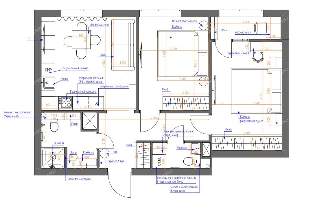 🔹  раздельный санузел - в меньшем санузел можно расположить туалет или постирочную, или оборудовать гардероб;