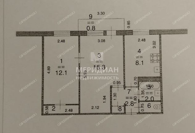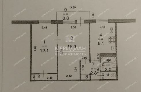 Общая площадь 43,1 кв.м., жилая - 27,4 (комнаты 15,3 и 12,1 кв.м.), кухня 8,1 кв.м.